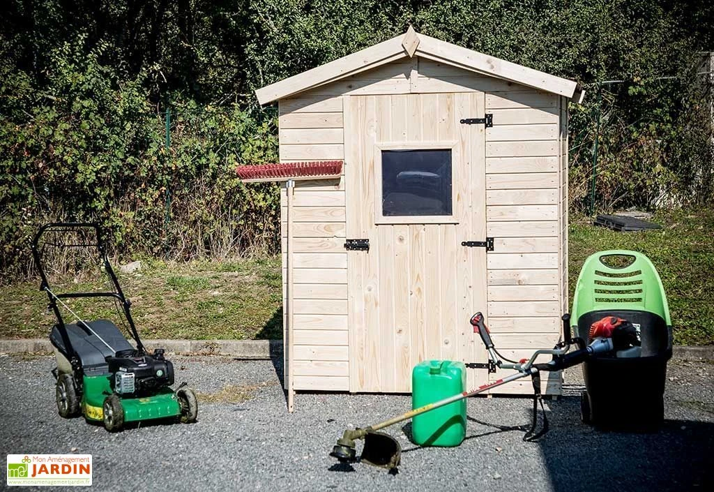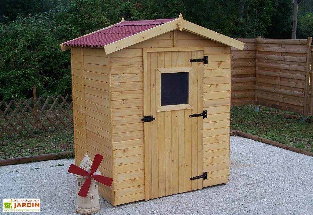 La charpente de l’abri de jardin est constituée de 2 pignons en panneaux pré-montés d’épaisseur 16 mm fixées sur un cadre de section 25 x 25 mm et de 6 poutrelles en bois massif. La couverture est en plaques ondulées bitumées de couleur avec deux faîtières. La surface utile intérieure est de 1,83 m². Les dimensions extérieures hors tout de l’abri de jardin sont : 1,80 x 1,45 m (l,L ), les dimensions au sol sont 1,6 x1,2 m (l,L ).