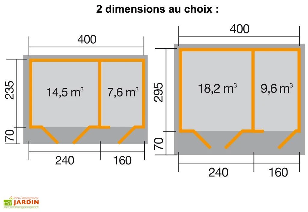 Le chalet de jardin existe dans deux dimensions disponibles dans vos options : 235 x 400 cm (l,l) avec une grande pièce de 235 x 240 cm et une plus petite de 235 x 160 cm. L’autre abri dispose de dimensions de 295 x 400 cm (l,l) avec une grande pièce en 295 x 240 cm et une plus petite pièce de 295 x 160 cm.