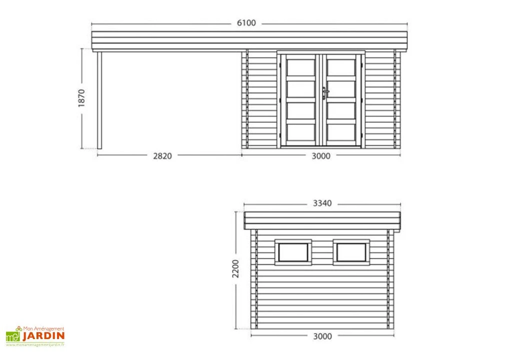 L’abri de jardin mesure au total 3 m de profondeur et 5,81 m de largeur. La partie fermée dispose d’une porte double de 1,50 m de largeur et 1,72 m de hauteur. Les fenêtres et la porte comportent du plexi blanc opalin. L’épaisseur du bois est de 28 mm.
