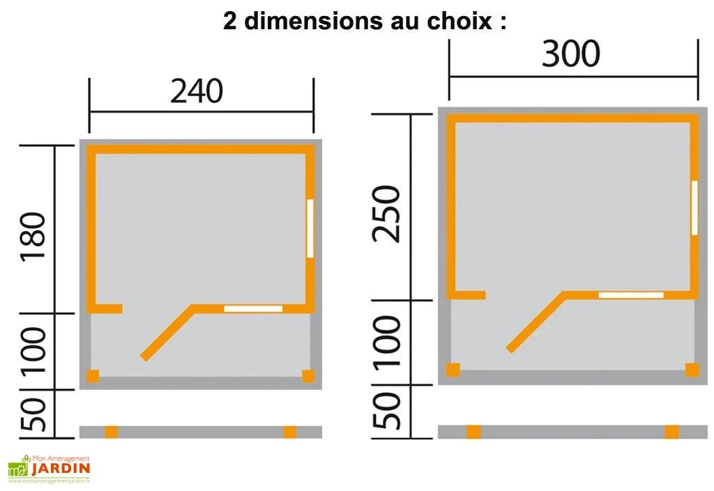 Le chalet en bois existe dans deux dimensions que vous pourrez choisir dans vos options : 180 x 240 x 240 cm (l,l,h) ou 250 x 300 x 240 cm (l,l,h). Le plancher, livré avec l’abri, est en bois massif avec des bords lisses de 20 mm. La sous toiture fait 19 mm d’épaisseur et le toit a un revêtement en bitume.