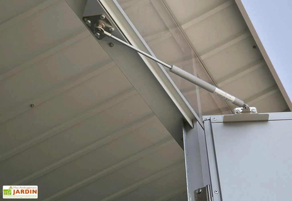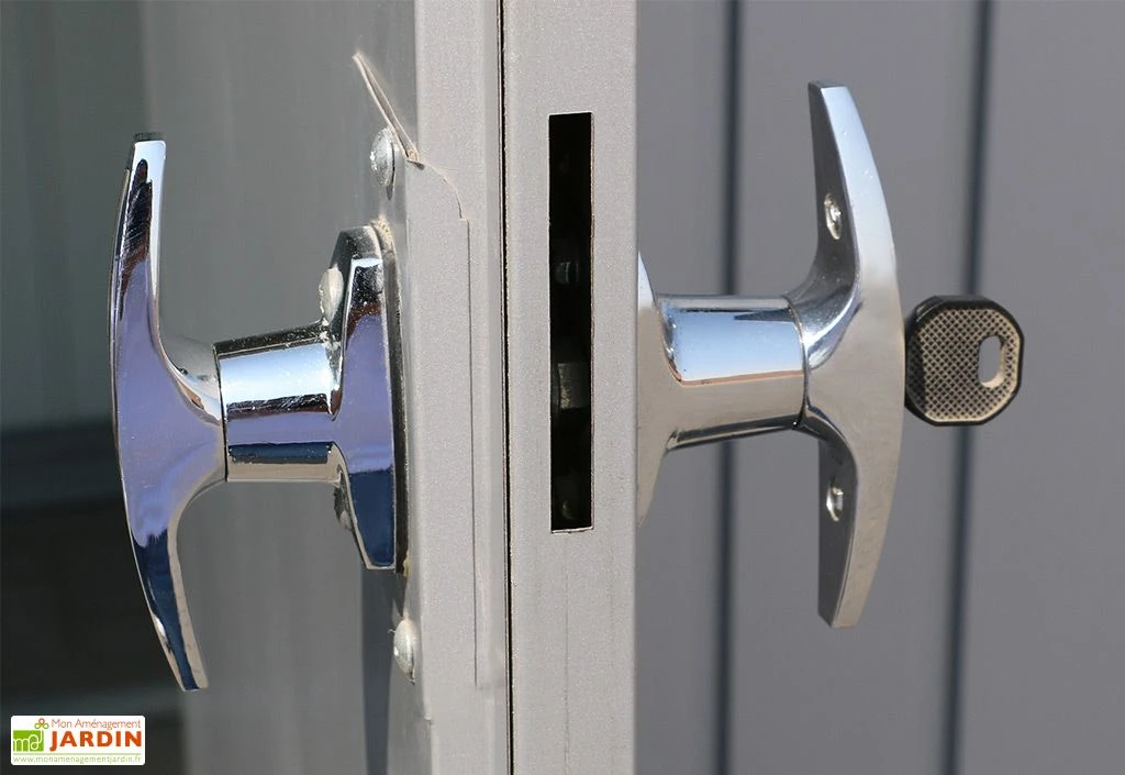 La porte battante comprend un vérin à gaz qui permet d’en amortir l’ouverture et la fermeture. Pour plus de solidité, elle est renforcée et doublée, avec une épaisseur de 33 mm. L’abri est sécurisé par la présence d’une serrure cylindre et de 2 clés.