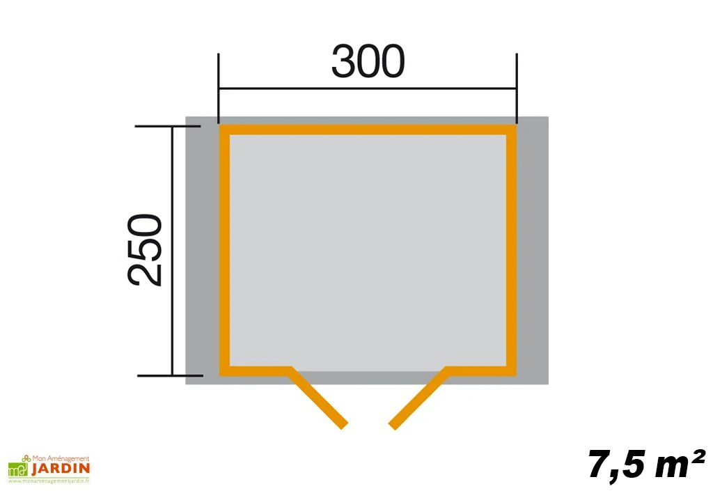 - Surface à couvrir pour l’abri de 7,5 m² (3 x 2,5 m) : 11,2 m²