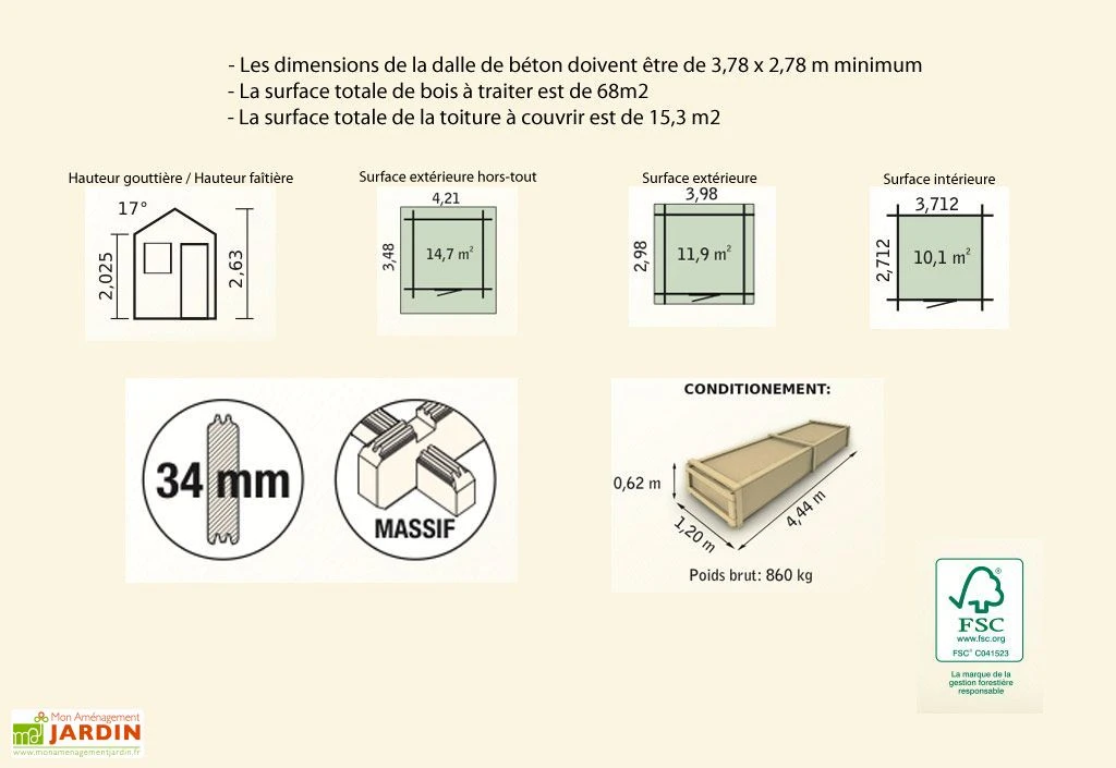 Vous pouvez installer votre chalet en bois sur une dalle ou sur des plots de bĂ©ton. Les dimensions extĂ©rieures hors tout sont de 4,21 x 3,48 m. Les dimensions extĂ©rieures de l’abri sont de 3,98 x 2,98 x 2,63 m et l’intĂ©rieur mesure 3,71 x 2,71 m, pour une surface utile de 10,1 m².Â