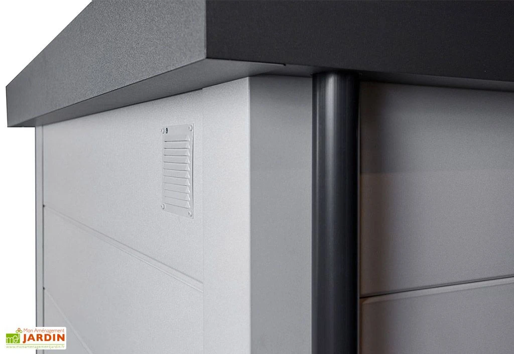 Côté couverture, cet abri de jardin s’est vue doté d’un toit plat (inclinaison du toit : 2°) constitué de panneaux sandwich isolés de 4 cm d’épaisseur. Il pourra supporter une charge de neige maximale de 220 kg/m² et intègre un système de gouttière avec descente conçu pour assurer le bon écoulement de l’eau de pluie pendant et après une averse.