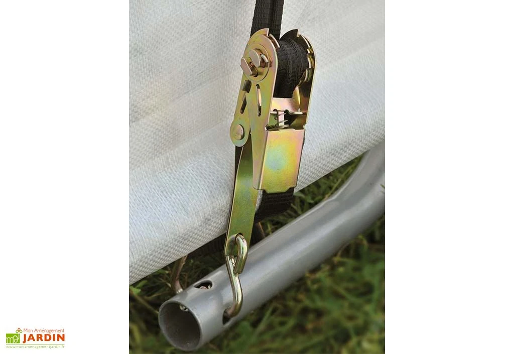 Avec des dimensions de 3 x 3 m, cet abri de jardin souple occupera une surface de 9 m² une fois installé dans votre extérieur. Il devra être fixé au sol à l’aide des quatre ancrages inclus. Huit sangles d’arrimage vous seront également fournies pour la fixation de la bâche à l’armature. Notez enfin que cet abri pourra être fermé grâce à une porte enroulable de 260 x 210 cm (largeur x hauteur).