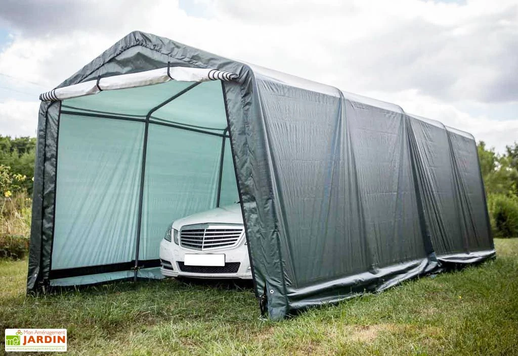 Cet abri de jardin en toile de chez Habrita est à la fois étanche et robuste grâce à ses matériaux. Il offre un lieu de stockage fonctionnel permettant d’abriter du mobilier de jardin, des outils, une tondeuse autoportée, une remorque, une moto ou même une voiture.