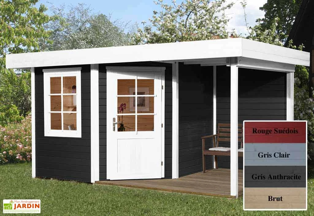 Le toit du chalet possède un débord de 50 cm en avant, 24 cm en arrière et 20 cm sur les côtés. La hauteur totale de votre abri est de 2,24 m. Deux dimensions sont proposées dans vos options (abri + appentis compris) : 2,40 x 3,90 m (l,l) ou 3 x 4,50 m (l,l). Votre abri existe en 4 coloris au choix : brut, rouge suédois, gris clair ou gris anthracite, à sélectionner selon vos goûts.