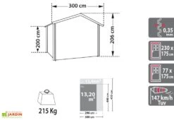 L’abri pour robot tondeuse de chez Forest Style mesure 87 x 76 cm pour une hauteur de 52 cm. Ses dimensions au sol sont de 78 x 69 cm et il couvre une surface de 0,54 m². L’intérieur mesure 76 x 67 cm et offre une surface de rangement de 0,51 m².