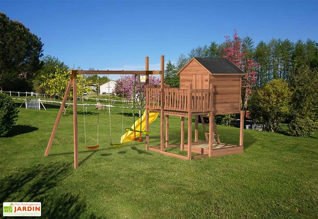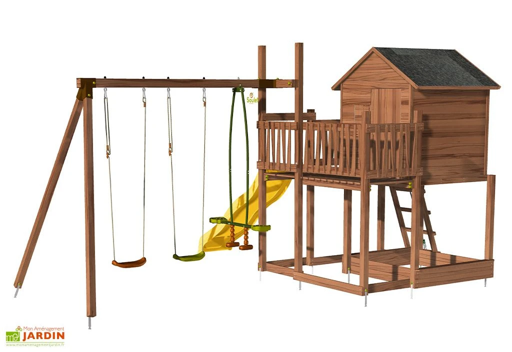 L’aire de jeu Tenerife de la marque Soulet est équipée d’un toboggan et de deux balançoires pouvant respectivement 50 kg maximum et d’une face-à-face pouvant supporter 70 kg maximum. Vos enfants et leurs amis pourront s’amuser durant de longues heures grâce à l’emplacement pour bac à sable (sable non fourni) et les nombreux accessoires ludiques : drapeau à hisser, volets mobiles…