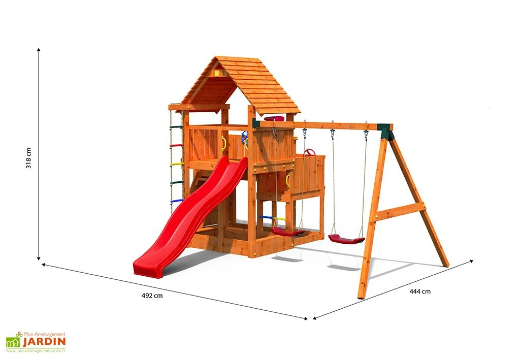Au programme : une tour de 3,20 m de haut avec maisonnette, toboggan de 2,90 m de long, échelle de corde et corde à grimper, deux balançoires et un petit mur d’escalade. Un bac à sable est également présent sous la plateforme. Le tout est conforme à la norme EN 71 et affiche des dimensions de 4,45 x 4,93 m. Cette aire de jeux en bois occupera donc une surface de 21,94 m² dans votre jardin.