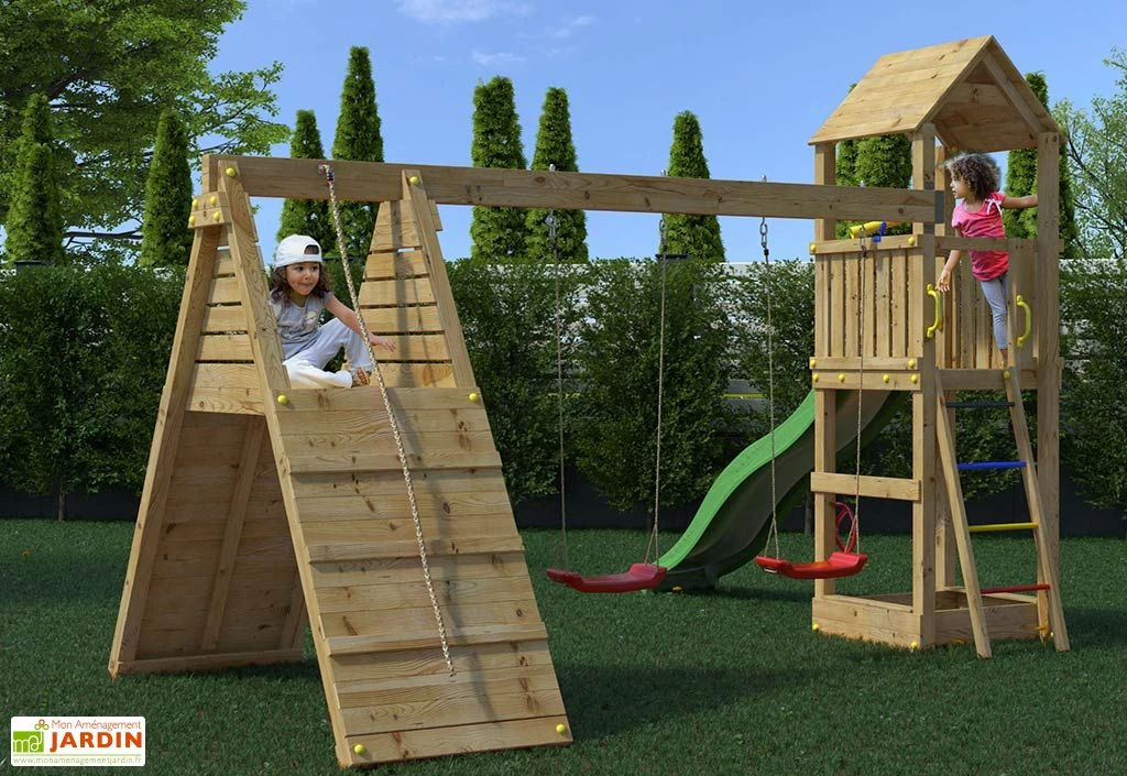 Cette aire de jeux d’extérieur est essentiellement conçue à partir de bois de pin sylvestre, à l’exception du toboggan de 2,20 m de long et des sièges des balançoires, en plastique. Ce bois est traité par autoclave classe 3, ce qui lui confère une belle protection contre l’humidité, les insectes et les moisissures susceptibles de le détériorer. Il est également certifié FSC, et provient donc de forêts gérées de manière écologique.