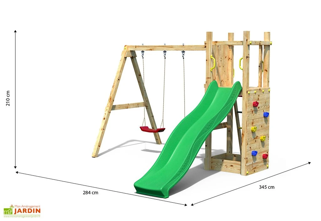 L’aire de jeux Funny 3 de chez Fungoo mesure 2,84 m de large sur 3,45 m de long. Elle occupe une surface de 9,80 m² et comprend une tour avec toboggan de 2,2 m de long et mur d’escalade. Un portique équipé de deux balançoires complète le tout.