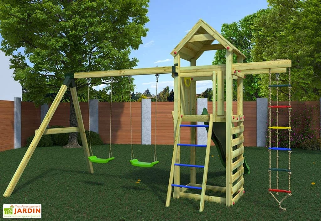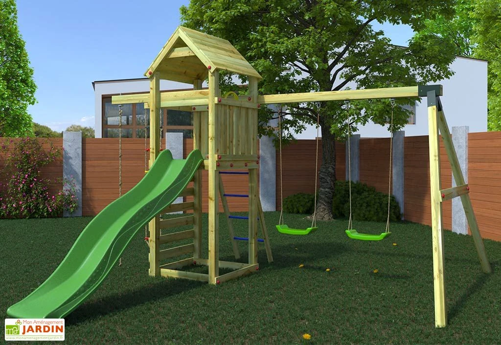 L’aire de jeux en bois Gaia de chez Fungoo vous est proposée dans une configuration composée d’une tour avec plateforme, d’un toboggan en plastique de 2,20 m de long, d’un portique double, d’une échelle de corde et d’une corde à nœuds. Cette aire de jeux d’extérieur est livrée en kit, accompagnée de tous les éléments nécessaires à son montage (ensemble d’outils, visserie en inox, crochets pour balançoires et kit d’ancrage).