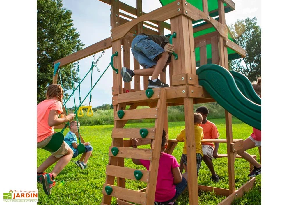 Cette aire de jeux pour enfant mobilise une solide structure en cèdre, un bois très résistant et qui ne demande aucun entretien particulier. Ce type de bois est en effet imputrescible, ce qui signifie qu’il ne craint ni la moisissure, ni les insectes qui pourraient le détériorer. Il n’a donc subi aucun traitement chimique et est recouvert d’une teinture à base d’eau, non nocive pour la santé de vos enfants.