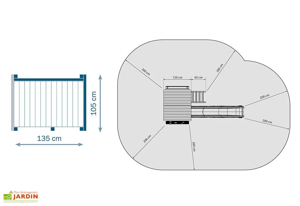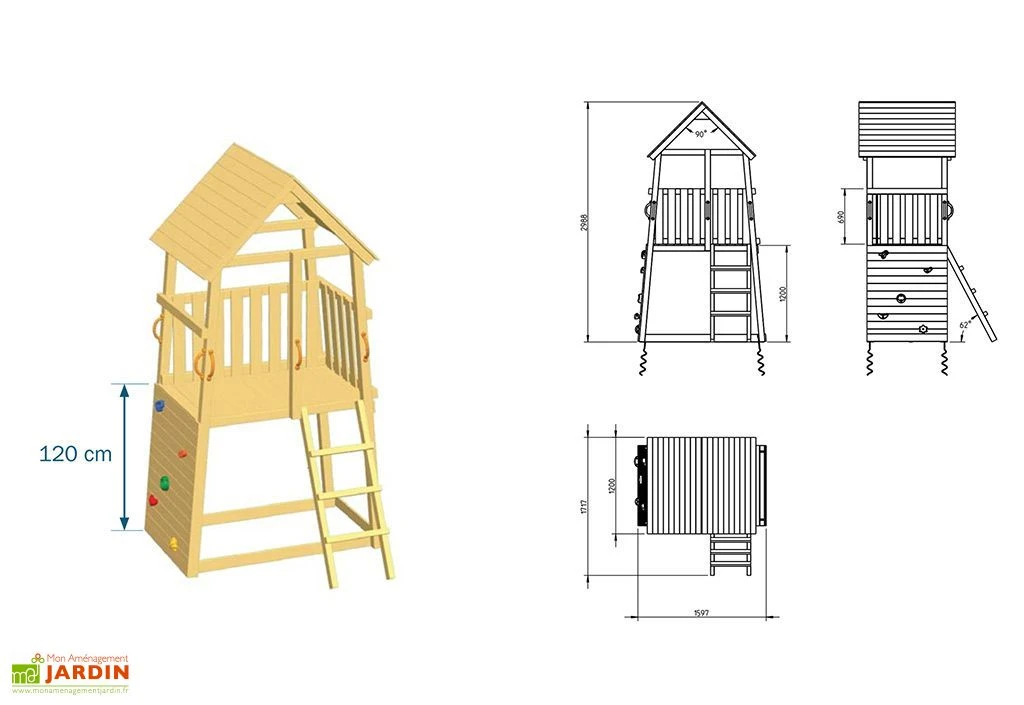Les poteaux qui composent l’ossature possède une section de 9 x 9 cm. L’emprise au sol de la tour avec l’échelle est de 1,71 x 1,59 pour une hauteur de 2,98 m. La hauteur du portique est de 2,08 m. La plateforme permettant aux enfant d’accéder au toboggan est à 1,20 m du sol. Elle est elle-même accessible par le mur d’escalade ou par l’échelle située à côté du toboggan.