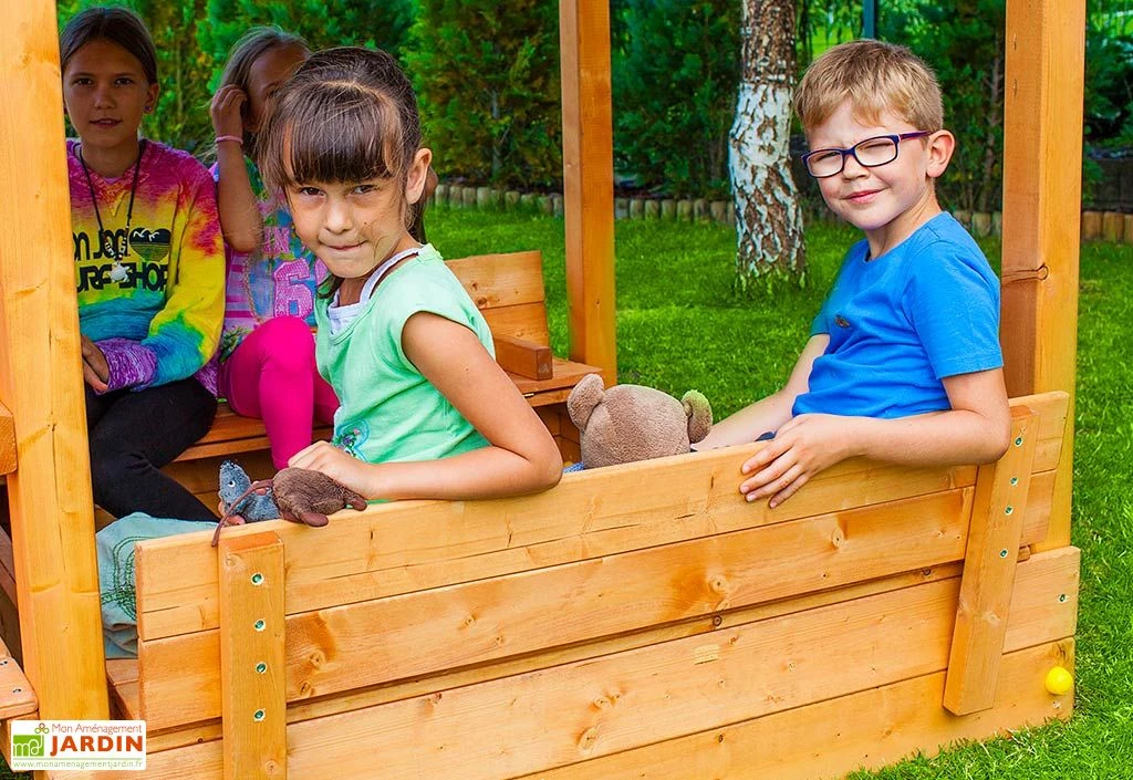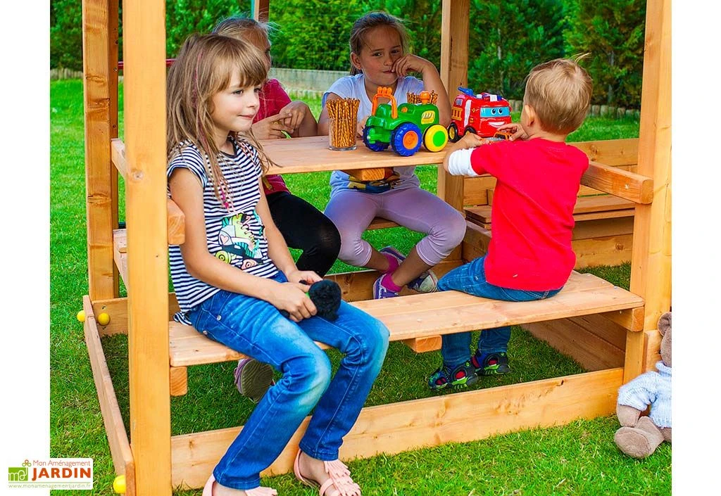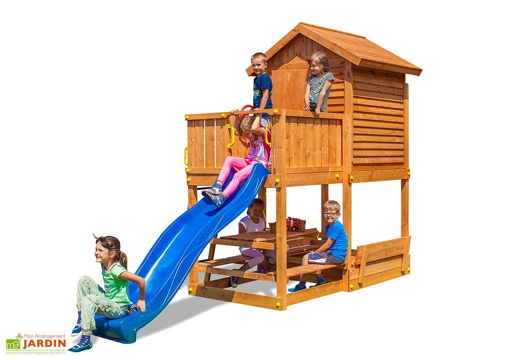 Composée d’une maisonnette sur plateforme avec toboggan de 2,20 m de long, cette aire de jeux en bois est idéale pour les enfants à partir de 3 ans. Elle s’est également vue dotée d’une table de pique-nique et de bancs situés sous la plateforme. Vous pourrez par ailleurs choisir la couleur du toboggan en plastique (rouge, bleu, vert ou jaune).