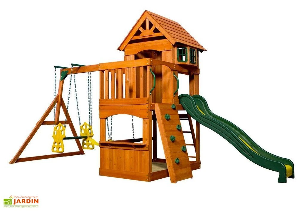 L’aire de jeux est en cèdre tropical, un bois qui résiste naturellement à la moisissure et aux attaques d’insectes et qui ne demande aucun entretien. Elle est peinte avec une teinture à base d’eau et aucun produit chimique n’a été utilisé.