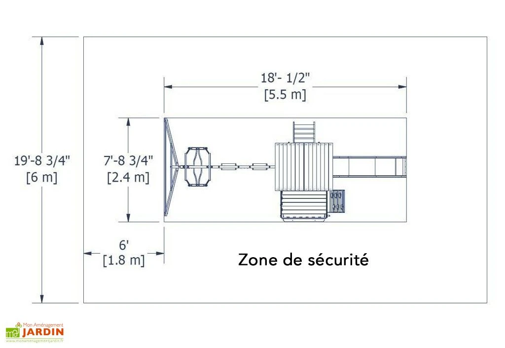 La grande aire de jeux mesure 5,50 m de longueur, 2,40 m de largeur et 2,90 m de hauteur. Elle peut être utilisée par 9 enfants simultanément. L’ancrage est inclus. La garantie est de 2 ans.