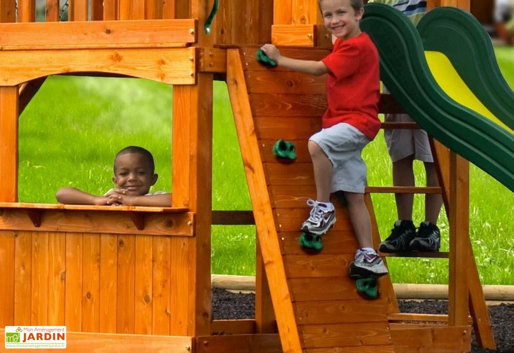 L’aire de jeux en bois est équipée de nombreux éléments, permettant aux enfants de 3 à 10 ans de s’amuser tous ensemble. Elle dispose :