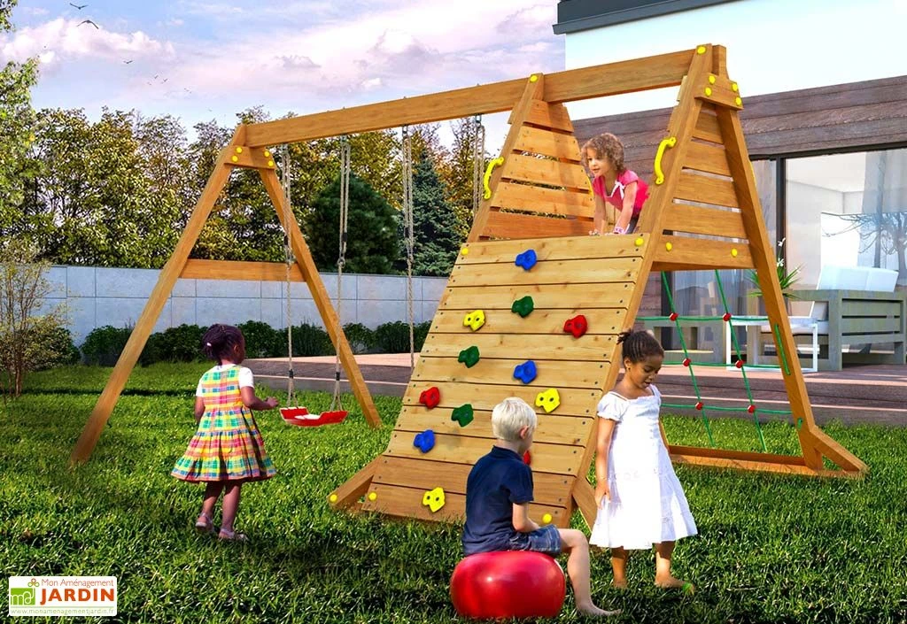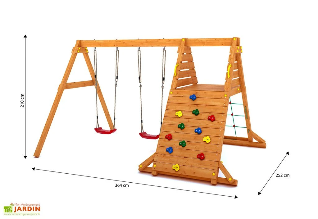 L’aire de jeux Spider King de la marque Fungoo inclut un portique avec deux balançoires, un mur d’escalade et une petite structure en corde à grimper. Le tout affiche des dimensions de 2,52 x 3,64 m et occupera 9,17 m² une fois monté dans votre jardin. Pensée pour les enfants âgés d’au moins 3 ans, cette aire de jeux en bois est conforme à la norme EN 71.