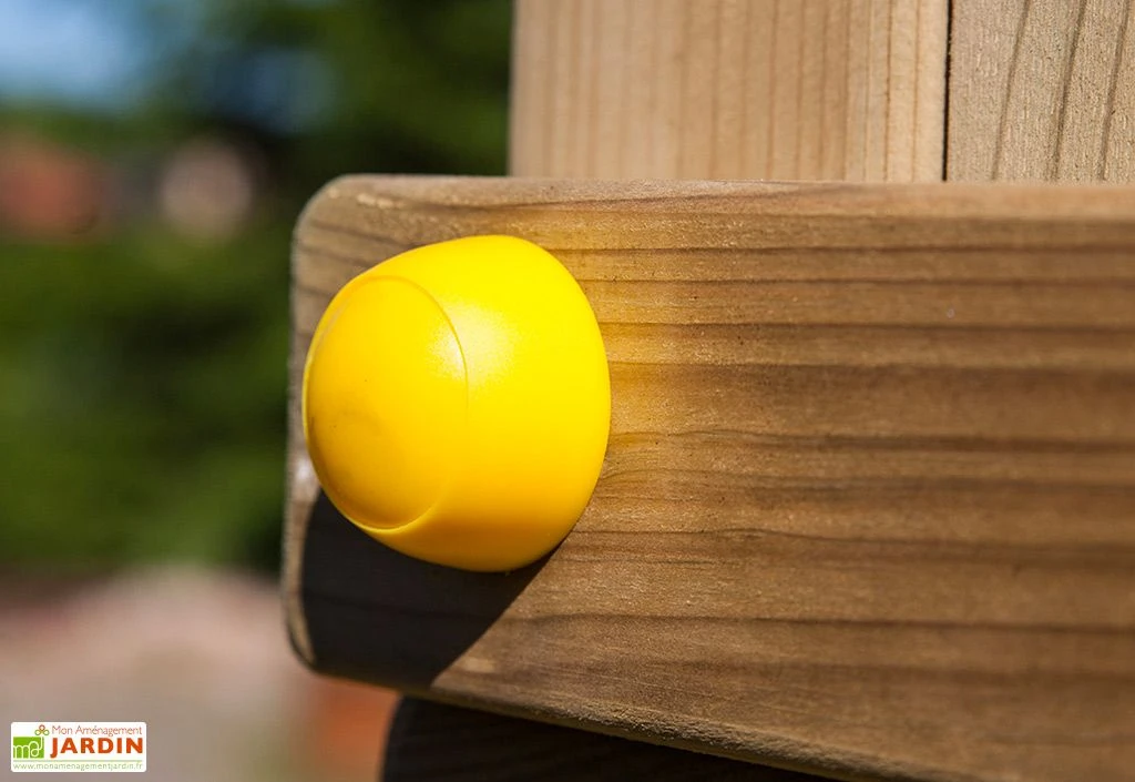 La visserie en inox, mais également les crochets pour balançoires, un ensemble d’outils et le kit d’ancrage, sont inclus. Pour des raisons de sécurité, il est recommandé de prévoir un périmètre de sécurité de 2 m tout autour de l’aire. Pensez-y avant de procéder au montage.