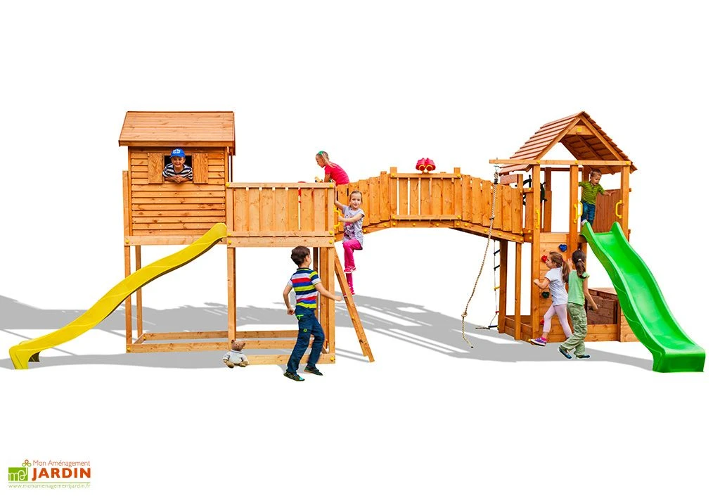 La seconde tour, plus complète, mobilise elle aussi un toboggan ainsi qu’un mur d’escalade, une corde à grimper et une échelle de corde. Le tout affiche des dimensions de 4,60 x 11,50 m et occupera une surface de 52,90 m² une fois installée dans votre jardin.