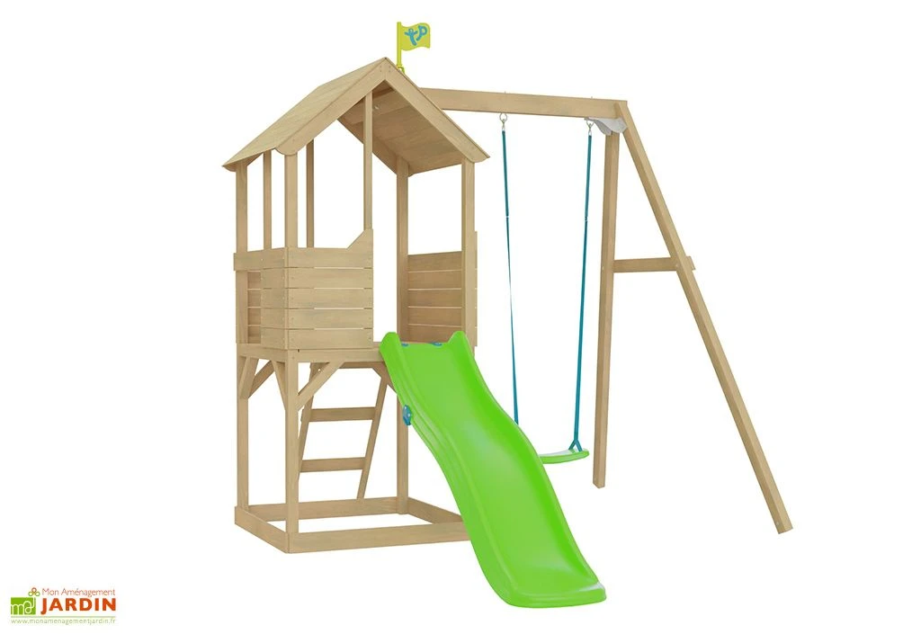 La maisonnette en bois est équipée d’une échelle pour atteindre aisément la plateforme. En dessous de cette dernière se trouve une seconde plateforme ombragée pouvant servir de bac à sable ou de piscine à balles. Un toboggan vert de 2,5 m de long permet à vos enfants de descendre plus rapidement de la maisonnette. Le portique doté d’une balançoire vient directement se fixer sur la petite maison.