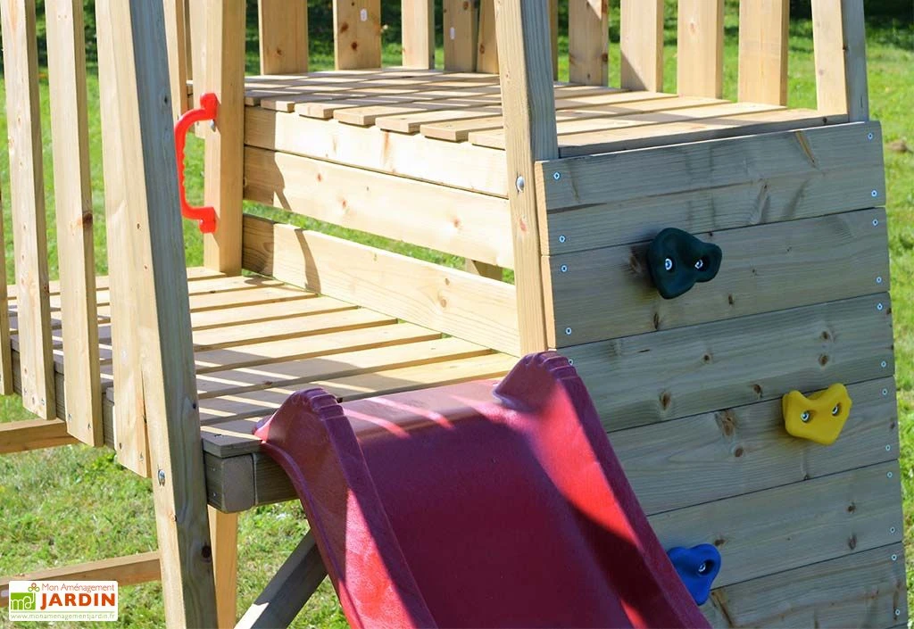 Le bois utilisé pour la fabrication de cette aire de jeu est certifié FSC, ce qui signifie qu’il est issu de forêts gérées de manière durable. Pour assurer la bonne protection du bois contre l’humidité, la moisissure et les insectes susceptibles de le détériorer, pensez à y appliquer un traitement fongicide et insecticide.