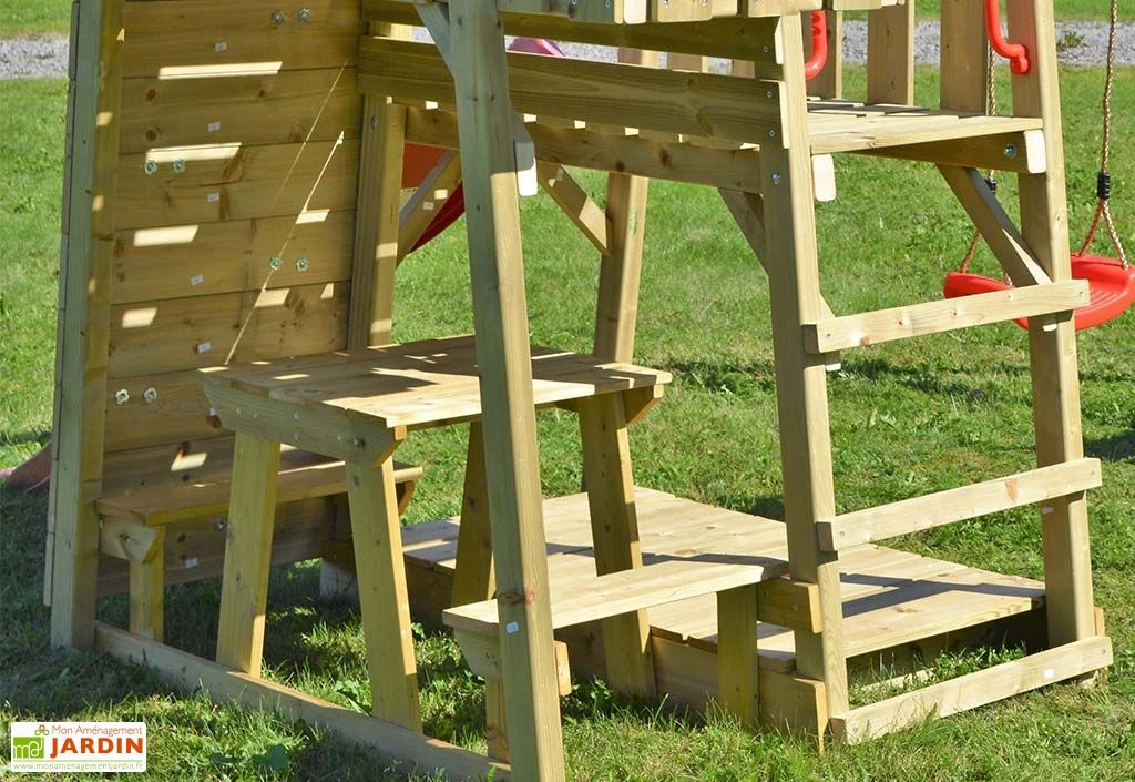 Ses deux plateformes situées à 90 et 120 cm de hauteur pourront être aisément atteintes grâce à la présence d’une petite échelle légèrement inclinée et la table de pique-nique logée sous la plateforme la plus haute permettra à vos enfants de dessiner ou de prendre le goûter en plein air !