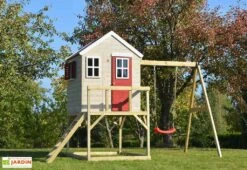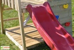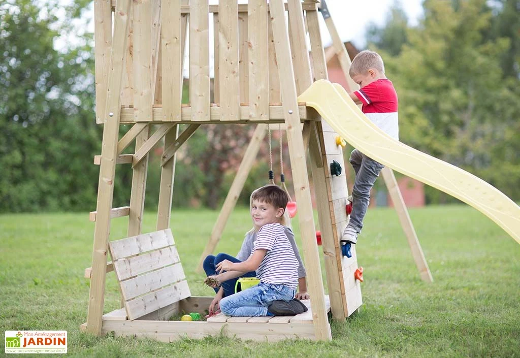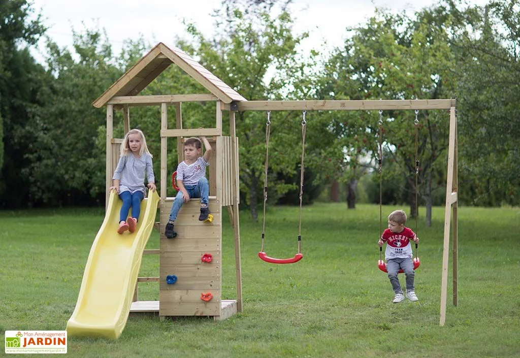 Cette aire de jeux pour enfant est fabriquée en bois brut, non traité. Nous vous conseillons d’y appliquer un traitement fongicide et insecticide afin de protéger le bois des intempéries, des champignons ou des insectes qui pourraient endommager la structure au fil du temps. Le bois utilisé est certifié FSC, ce qui indique qu’il provient de forêts gérées dans le respect de l’environnement. A noter que la structure de l’aire de jeux pourra être peinte si souhaité afin de s’intégrer plus facilement dans votre jardin.