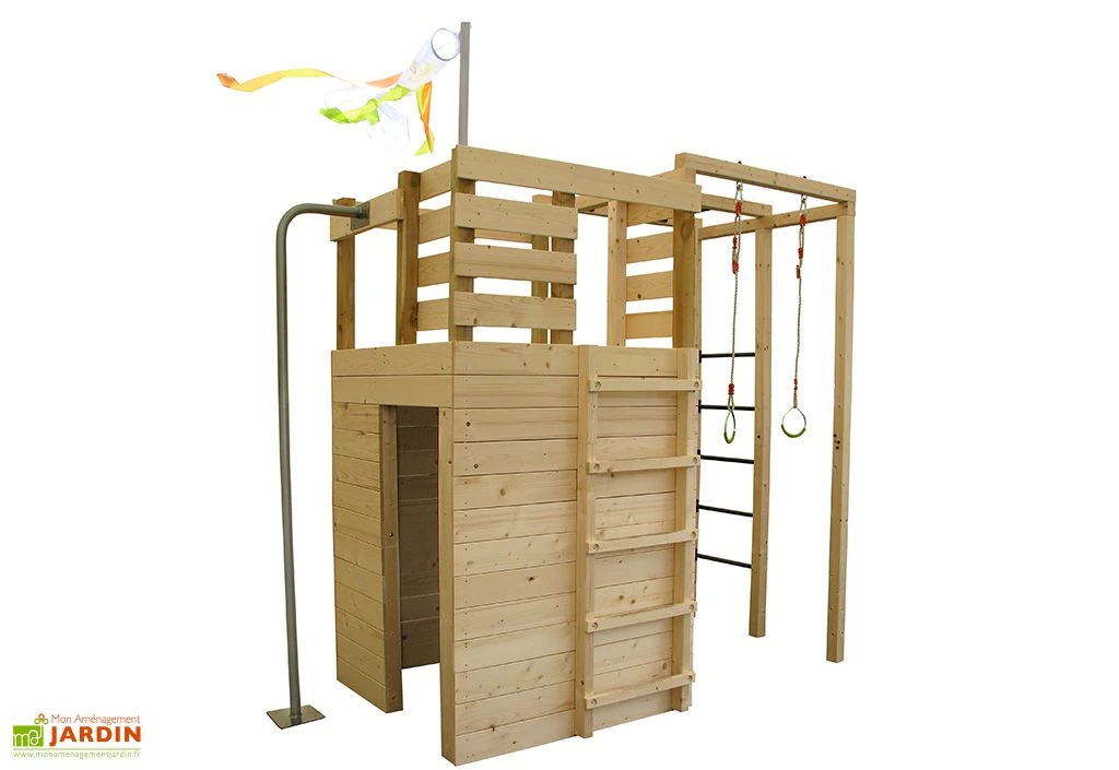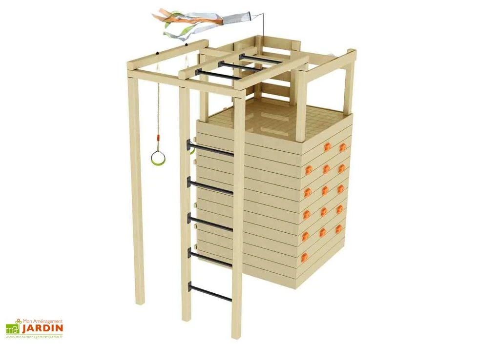 Cette aire de jeux est fabriquée en bois brut à partir de lames d’une épaisseur de 16 mm. Le bois brut peut être peint pour personnaliser la structure au goût des enfants. Pensez également à prévoir un traitement fongicide et insecticide pour lui offrir une belle durée de vie.