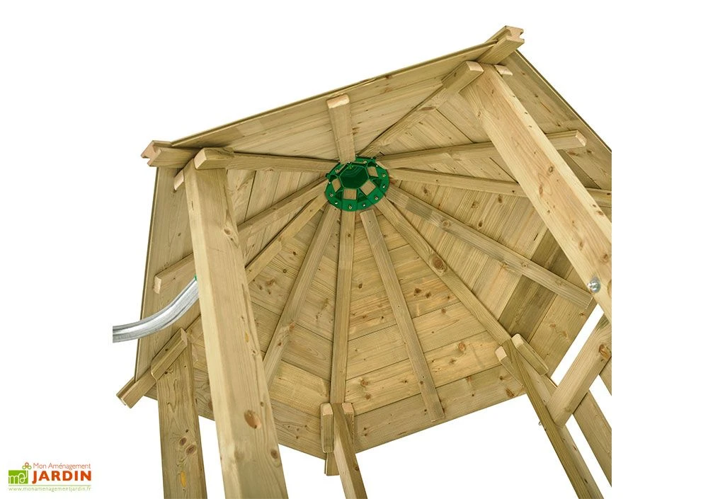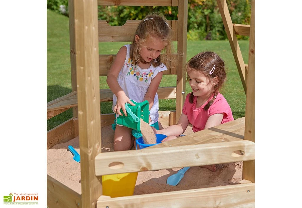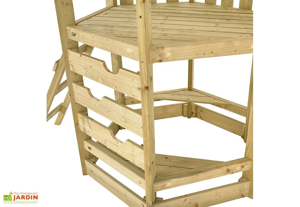 La tour en bois est équipée d’une échelle et d’un mur d’escalade permettant d’accéder facilement sur la plateforme. Le toit va protéger vos enfants lors des intempéries, mais également des rayons du soleil lors des fortes chaleurs. En dessous de la plateforme se trouve un bac à sable ombragé avec un banc en bois. L’aire de jeux de jardin est également dotée d’une barre de pompier permettant de sortir rapidement.