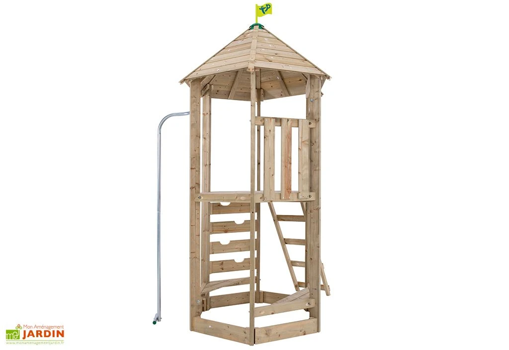 Cette aire de jeux de la marque TP Toys est destinée à des enfants âgés de 3 ans et plus. Elle se compose d’une grande tour, d’une rampe de pompier et d’un bac à sable. Le jeu d’extérieur est fabriqué à partir de bois certifié FSC, signifiant que le bois provient de forêts gérées dans le respect de l’environnement. L’ensemble mesure 159 cm de long sur 127 cm de large, pour 287 cm de haut.