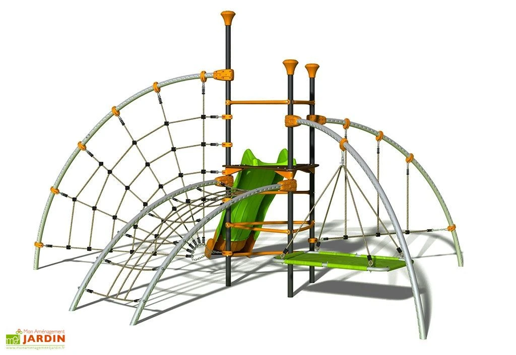 L’aire de jeux comporte un toboggan avec une glissière de 2,63 m de long. Un pont de singe se présentant sous forme d’un cordage à grimper. Une corde tibétaine pour tester sa force et son équilibre. Un tapis volant pour se reposer et discuter entre copains. Une tour centrale pour observer tout le jardin et grimper par tous les côtés. Et une toile d’araignée pour s’amuser à grimper jusqu’en haut.