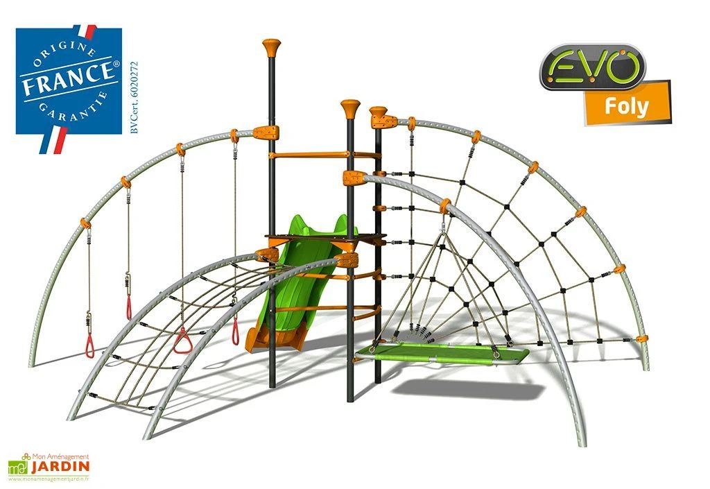 Votre aire de jeux de chez EVO est fabriquée en France. La structure est entièrement modulable grâce à un système sûr et breveté. Elle vous permet d’installer différents agrès et d’en changer facilement et rapidement, lorsque l’envie vous prend. La structure est en métal traité anticorrosion et les éléments modulaires sont en polyamide orange. Le montage se fait facilement grâce à une notice détaillée et aux outils nécessaires fournis.