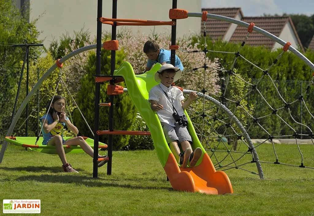 L’aire de jeux est livrée avec un toboggan de 2,63 m, une araignée en corde pour grimper, un pont de singe pour tester l’agilité, un tapis volant pour se reposer et se balancer et une tour centrale pour se poser et observer le jardin.