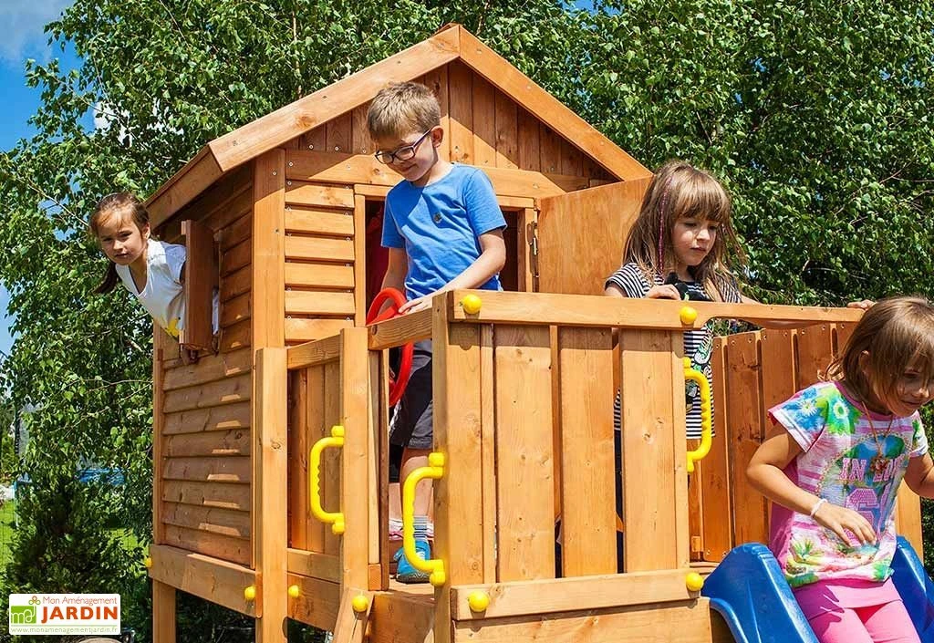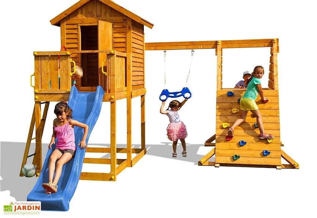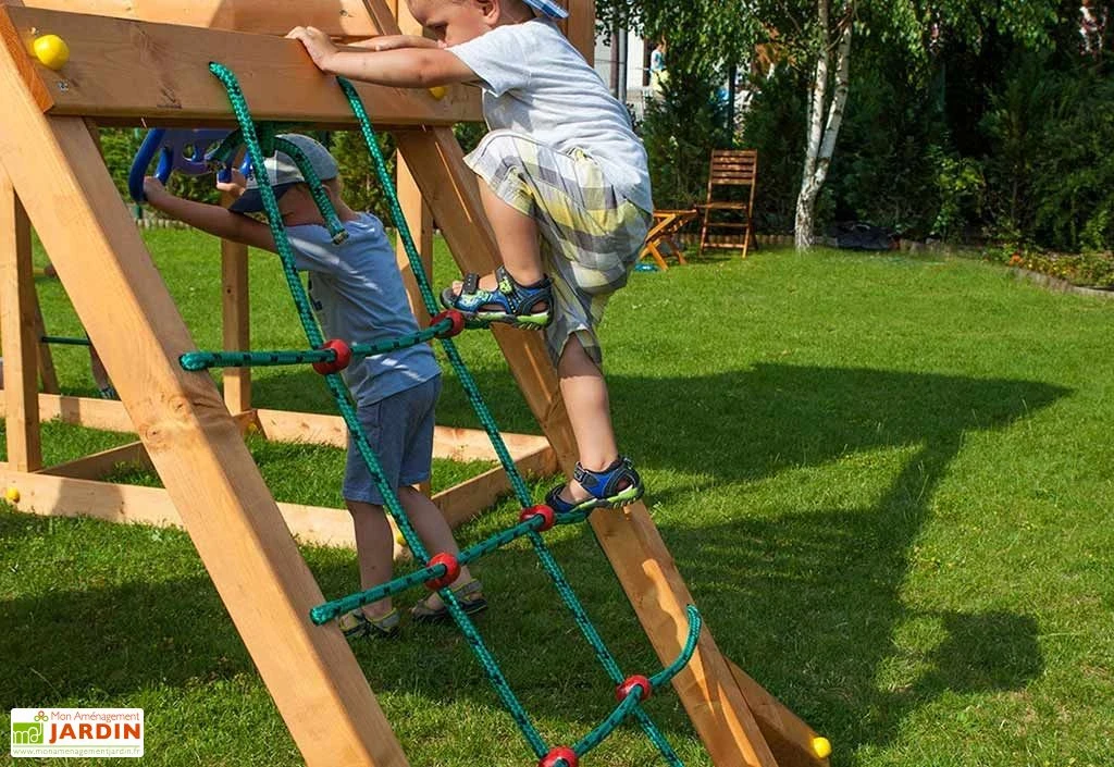 Le temps de montage est estimé à une journée pour deux personnes. L’aire de jeux respecte les normes EN 71 pour une utilisation en toute sécurité. La garantie est de 2 ans.
