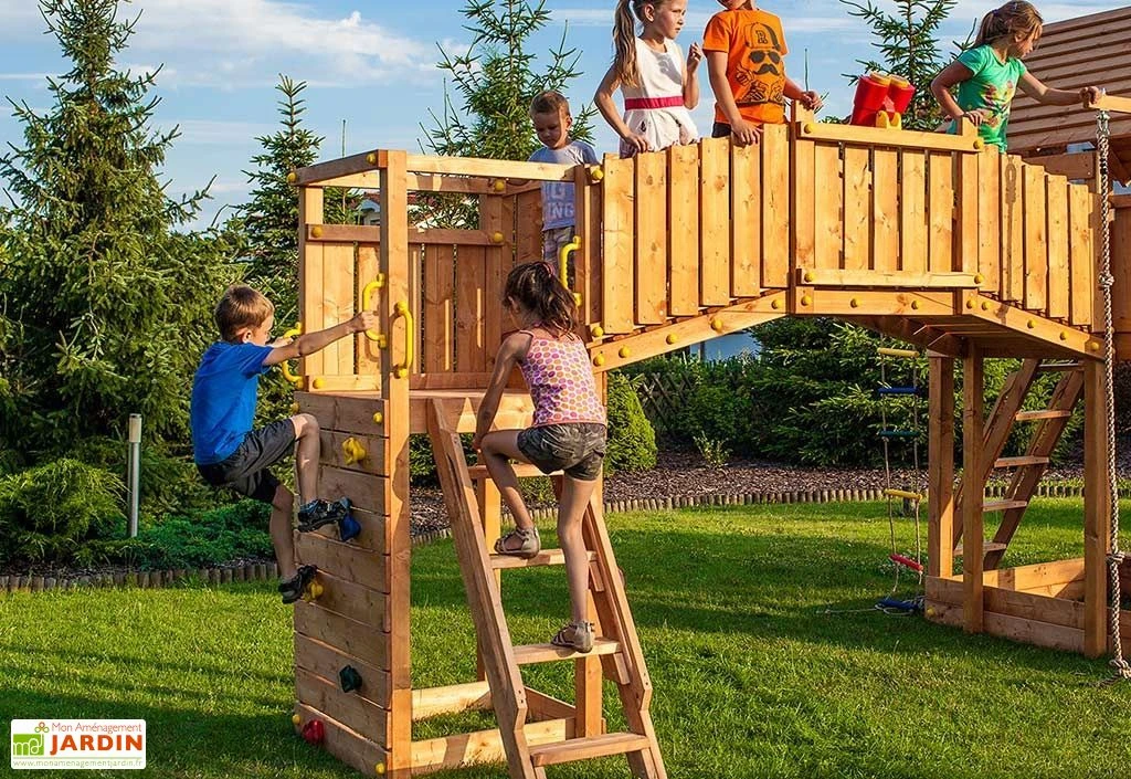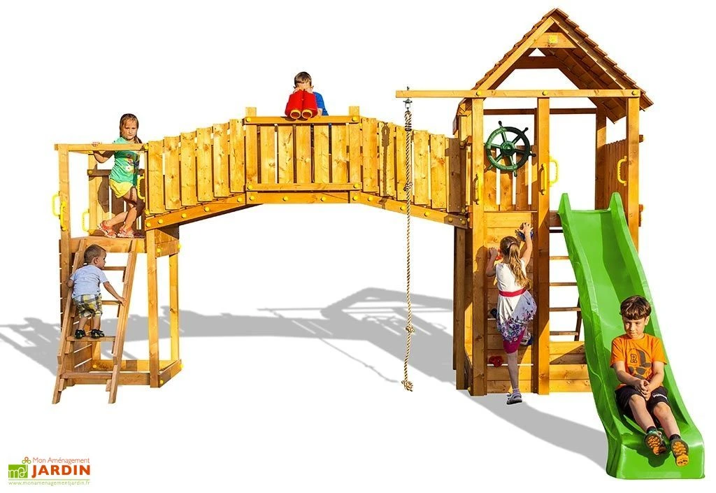 L’aire de jeux géante Fungoo est idéale pour les grands jardins. Elle mesure 4,60 m de longueur, 4,80 m de largeur et 2,90 m de hauteur. Elle est en bois recouvert d’une lasure de protection et constituée de 2 modules reliés par un pont.