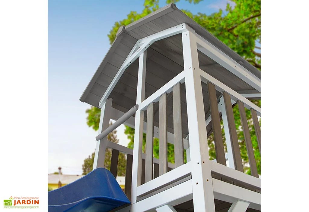 L’aire de jeux Beach Tower de la marque Axi se compose d’une tour avec plateforme, d’un toboggan à vagues en plastique de 2,20 m de long et d’un emplacement pour bac à sable, situé sous la tour. Ce dernier pourra contenir environ 125 kg de sable (sable non fourni). Le tout est destiné aux enfants à partir de 3 ans et est conforme aux normes CE et EN71.