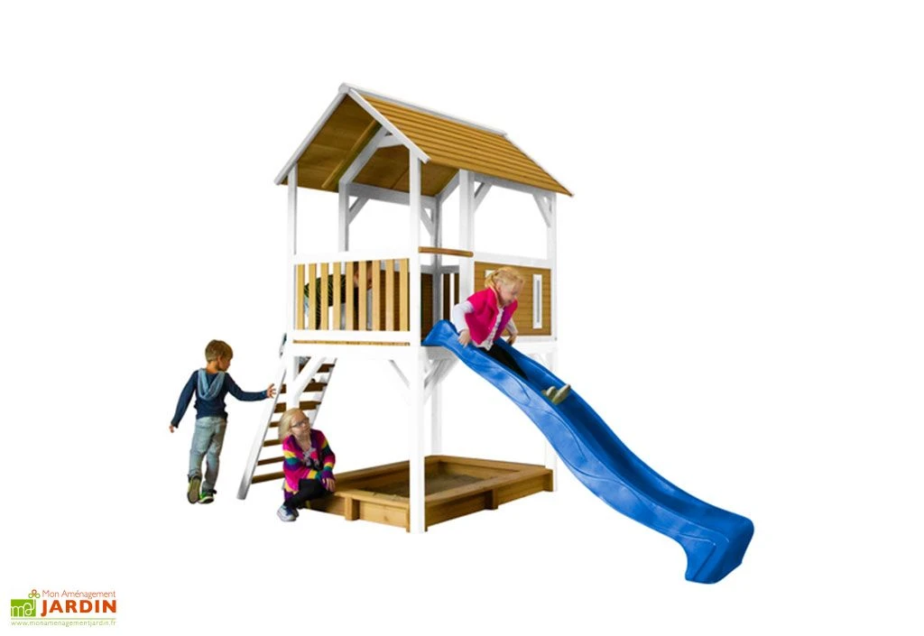 L’aire de jeux Safari Pumba Play Tower de chez Axi comprend une tour avec plateforme, un toboggan en plastique de 2,28 m de long et un bac à sable qui pourra contenir jusqu’à 300 kg de sable (non fourni). Le toboggan pourra même être raccordé à une arrivée d’eau les jours de grosses chaleurs !