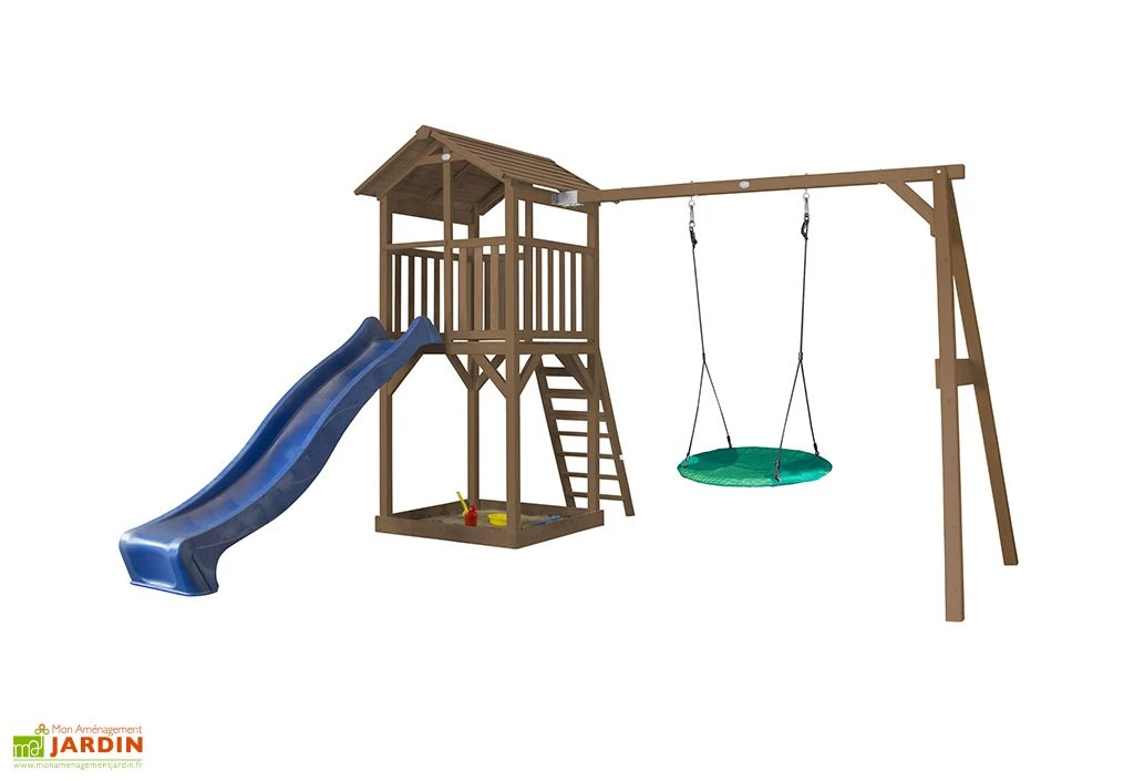 L’aire de jeux d’extérieur Beach Tower de chez Axi associe une tour avec toboggan à un portique équipé d’une balançoire nid d’oiseau. Le premier, conçu en plastique, possède une longueur de glisse de 220 cm et est disponible dans deux coloris au choix. La balançoire possède quant à elle une structure en acier et est revêtue d’un tissu synthétique rembourré à l’aide de mousse. Elle pourra être aisément réglée en hauteur.