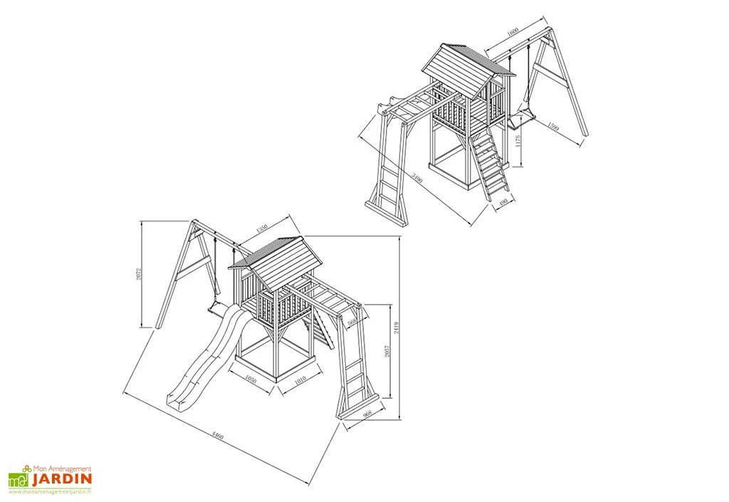 Cette aire de jeux d’extérieur affiche des dimensions de 3,49 x 4,46 m, pour 2,41 m de haut. Elle est à la fois solide et parfaitement stable, notamment grâce aux entretoises et aux ancrages inclus pour la fixation au sol de l’ensemble. Notez que cette aire de jeux étant livrée en kit, elle devra être montée et installée par vos soins. Les diverses pièces qui la composent sont toutefois pré-percées et prêtes à être assemblées, pour un montage plus facile.