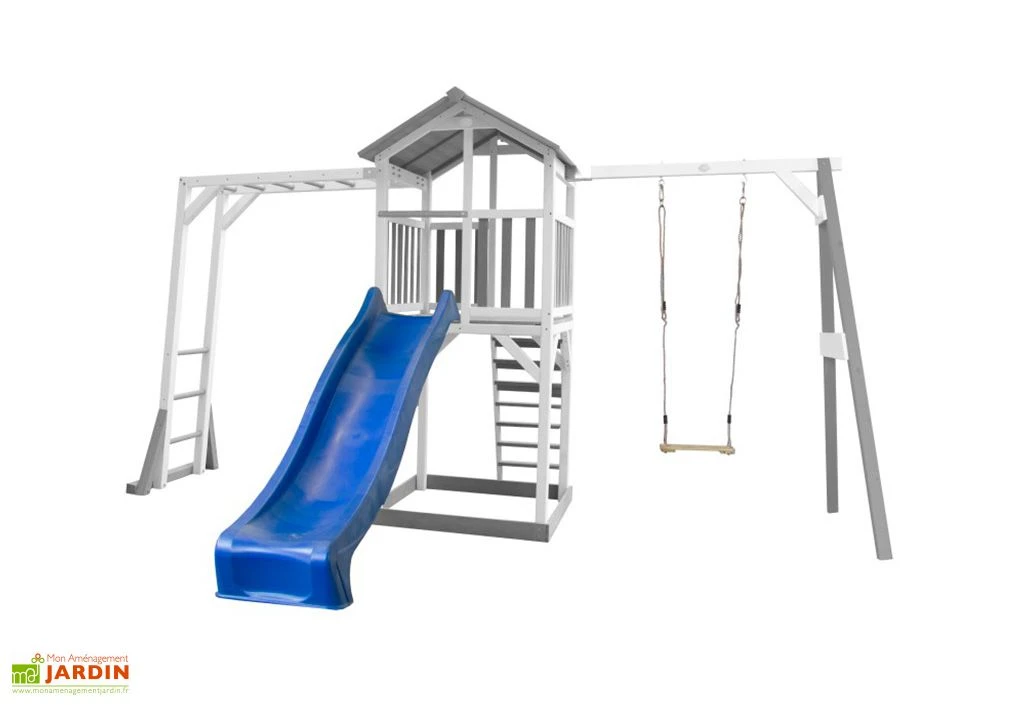 L’aire de jeux pour enfant Beach Tower de chez Axi comprend une tour centrale autour de laquelle sont disposés un portique avec balançoire simple et des barres de singe. Cette tour dessert un toboggan en plastique de 2,20 m de long (coloris au choix, bleu ou blanc) et couvre un espace bac à sable pensé pour contenir environ 125 kg de sable (non fourni). Le tout est conforme aux normes CE et EN71 et conviendra pour les enfants d’au moins 3 ans.