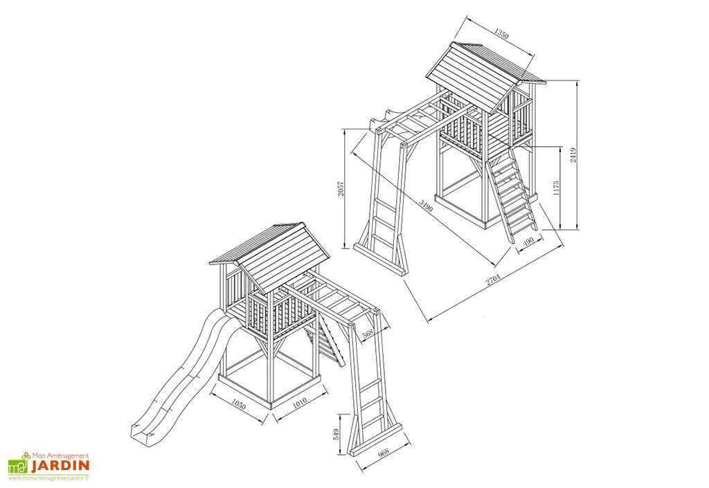 Cette aire de jeux en bois mesure 2,70 x 3,49 m, pour 2,41 m de haut. Elle est livrĂ©e en kit, Ă monter soi-mĂŞme, et occupera une surface de 9,42 m² une fois installĂ©e dans votre jardin. Notez enfin qu’afin de faciliter le montage, les diffĂ©rents Ă©lĂ©ments qui composent cette tour de jeux sont prĂ©-percĂ©s et prĂŞts Ă ĂŞtre assemblĂ©s.Â