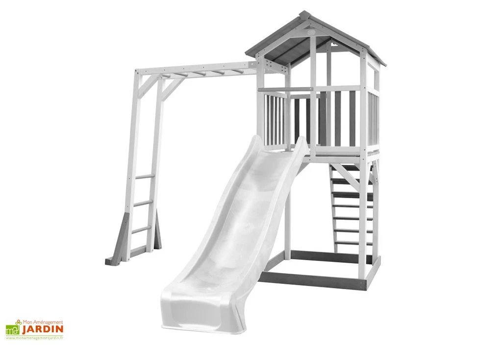 L’aire de jeux Beach Tower de chez Axi propose une combinaison destinĂ©e aux enfants âgĂ©s d’au moins 3 ans associant toboggan, barres de singe et bac Ă sable. Elle mobilise en effet une tour avec plateforme qui dessert un toboggan en plastique de 220 cm de long, un module d’escalade sous la forme de barres de singe et un emplacement pour bac Ă sable, situĂ© sous la tour (sable non fourni). Le tout est conforme aux normes CE et EN71.Â