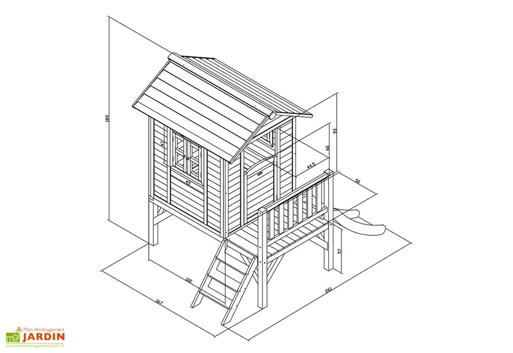 Cette cabane en bois affiche des dimensions hors tout de 167 x 261 x 189 cm (l,l,h). Ses dimensions intĂ©rieures sont de 97 cm de profondeur, 89 cm de largeur et 128 cm de hauteur. Elle est montĂ©e sur pilotis Ă 57 cm de hauteur et dispose d’un porche de 50 x 94 cm.Â