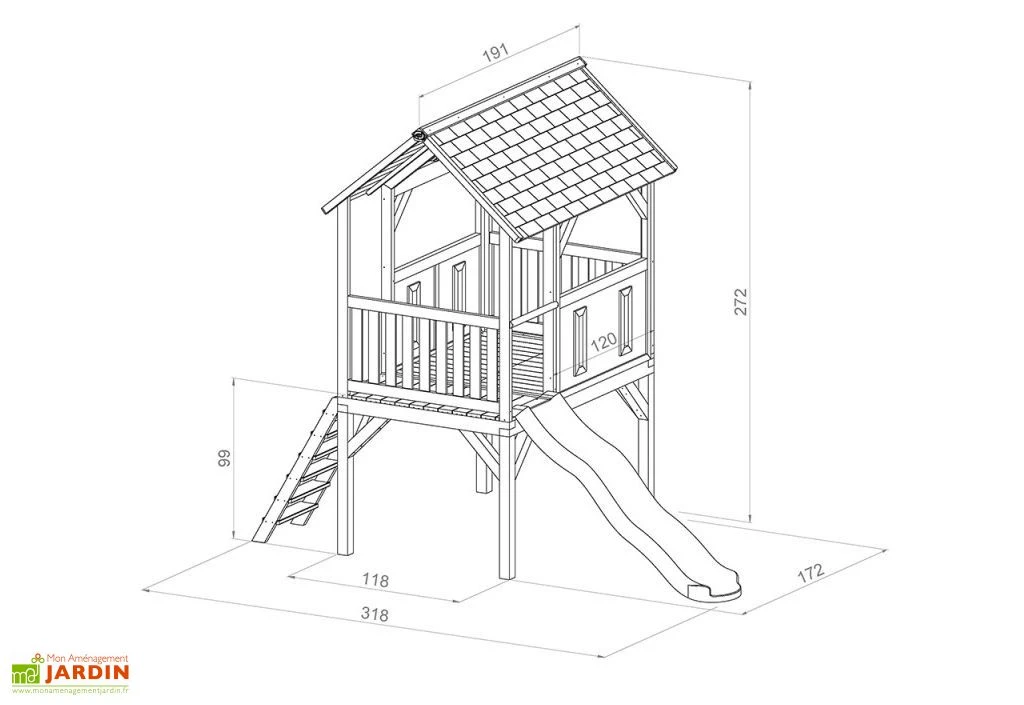 Cette cabane en bois est idĂ©ale pour les enfants à partir de 3 ans. Elle est montĂ©e sur pilotis et possède un toboggan d’une longueur de glisse de 180 cm. Le tout affiche des dimensions de 1,72 x 3,18 m, pour 2,72 m de haut, et vous sera livrĂ© en kit. Vous devrez alors procĂ©der vous-mĂŞme Ă l’installation de cette aire de jeux (temps de montage : environ 2h30). Notez enfin que cette maisonnette en bois est conforme aux normes CE et EN71.Â
