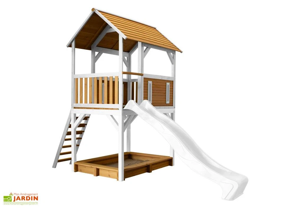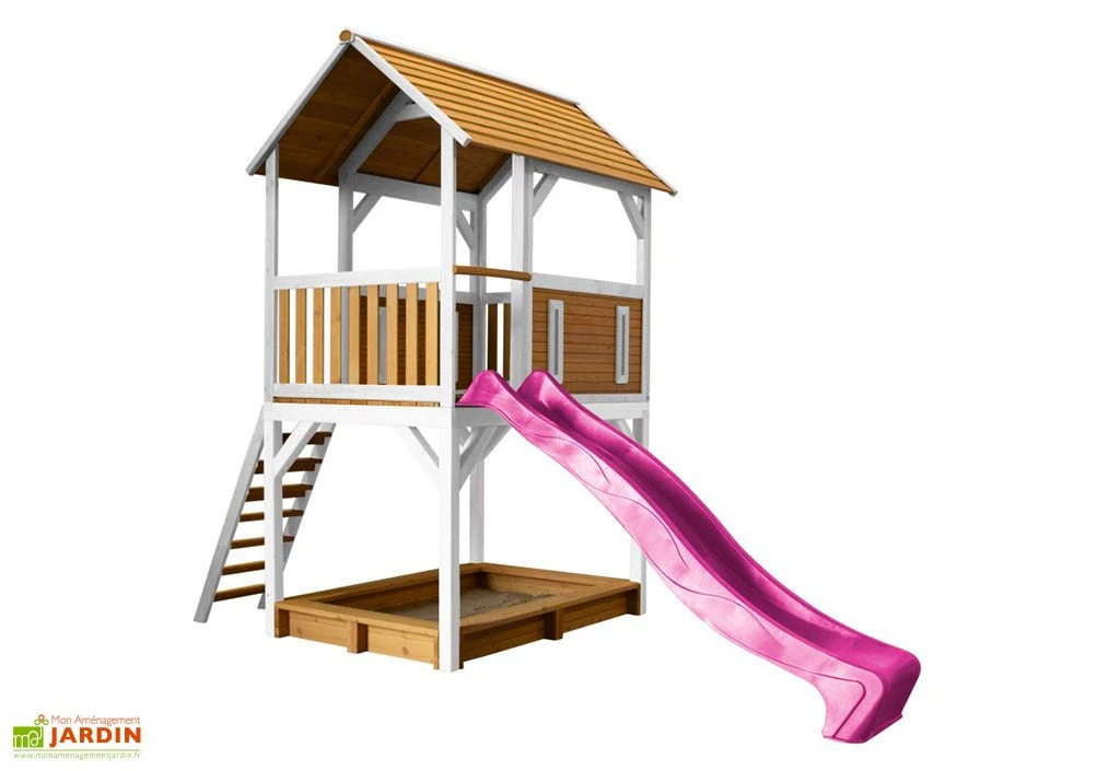 La maisonnette pour enfant Pumba de chez Axi est montée sur pilotis. Elle possède donc une plateforme située à 118 cm du sol, plateforme desservant un toboggan de 220 cm de long et sous laquelle se trouve un espace pour bac à sable. Si une bâche de protection pour le bac à sable est incluse, le sable n’est toutefois pas compris. Cette aire de jeux mesure 1,70 m x 3,70 m, pour 2,91 m de haut.