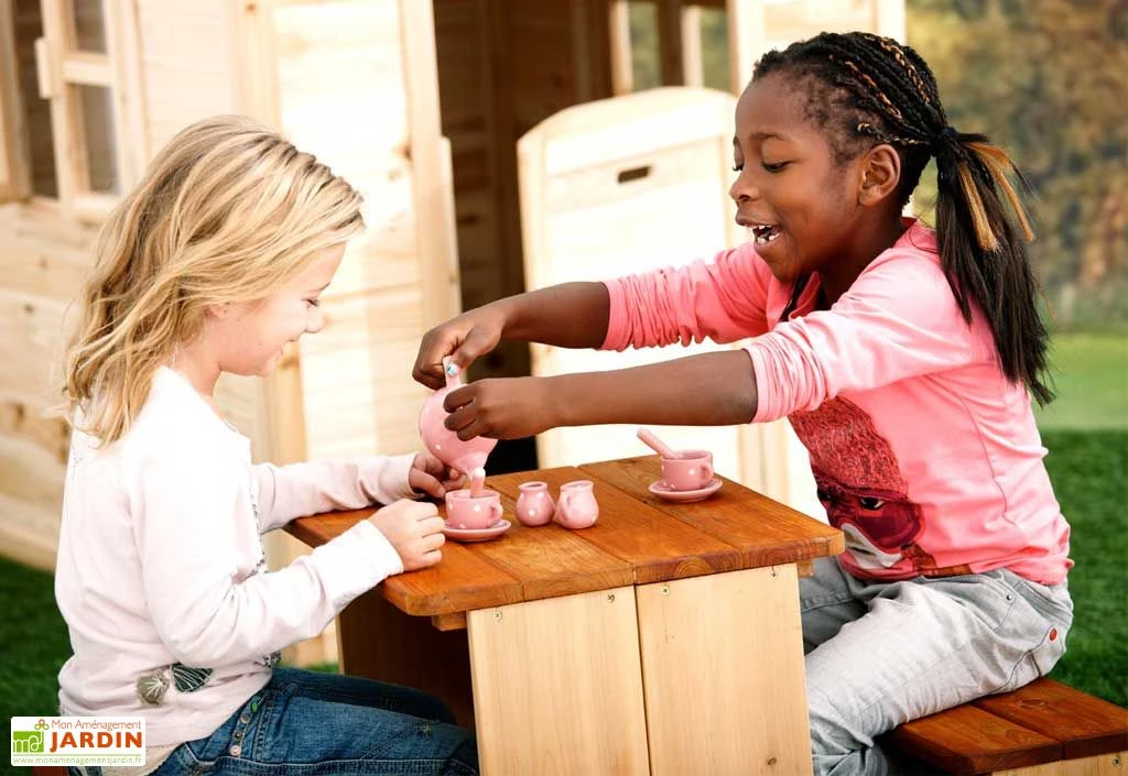 La table de pique-nique pour enfant de chez Axi est en cèdre naturel non traité chimiquement. En effet, ce bois offre l’avantage d’être naturellement imputrescible. Livrée avec ses bancs assortis, elle permettra d’aménager la maisonnette de votre enfant.