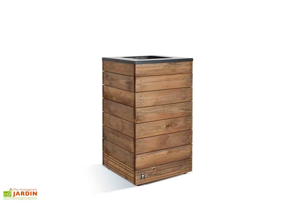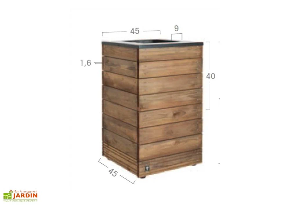 Ce bac à fleurs Selekt de chez Jardipolys possède une contenance de 63 L. Il a été fabriqué en France à partir de bois de sapin et épicéa traité autoclave de classe 3 pour lui permettre de rester dehors toute l’année sans pourrir ni se dégrader. Son bois est également certifié FSC car il est issu de forêts gérées de façon durable et responsable. À l’intérieur, ce pot de fleurs mesure 40,8 x 40,8 cm (longueur, largeur) sur 40 cm de hauteur. Ses dimensions extérieures sont de 45 x 45 cm (longueur, largeur) pour 76 cm de hauteur.